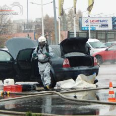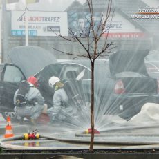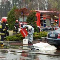 Po przybyciu służb na miejsce ustalono, że w jednym z samochodów osobowych zaparkowanych na parkingu doszło do rozszczelnienia pojemnika w którym przewożono 40 kilogramów 55% roztworu kwasu azotowego. Na miejscu znajdowała się właścicielka pojazdu która po stwierdzeniu wycieku kwasu opuściła auta zamykając drzwi i klapę bagażnika. –poinformował nasz portal bryg. Marian Marszałek, rzecznik prasowy KM PSP w Nowym Sączu.