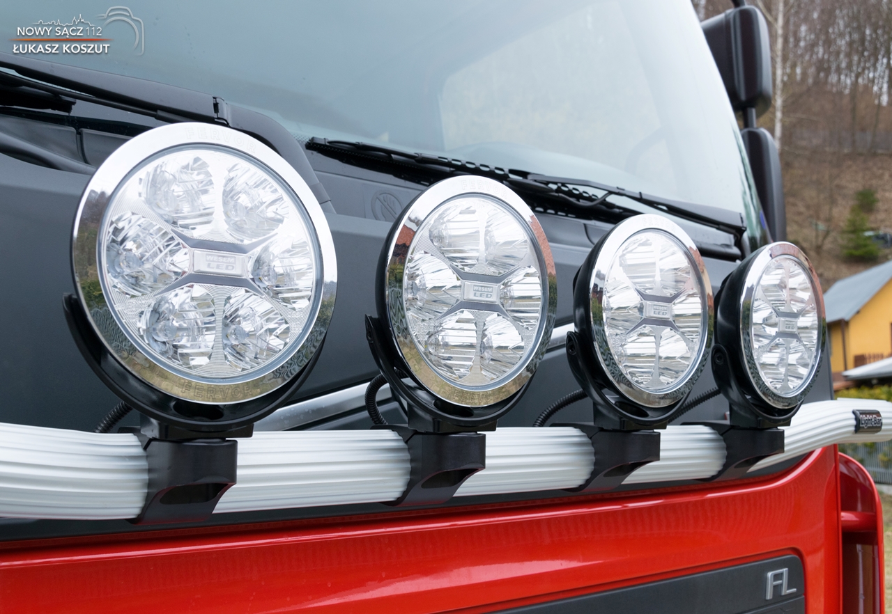 Jeżeli chodzi o oświetlenie wewnętrzne i zewnętrzne nowego samochodu pożarniczego OSP Żegiestów to wykonano je w technologii LED. Dodajmy, że przodu kabiny zamontowano dodatkowo 4 reflektory dalekosiężne.